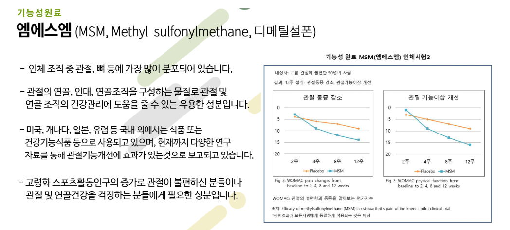 MSM의 효능에 대해 살펴보면 퇴행성 관절의 기능을 개선하고 통증을 완화시켜주는데 도움을 줍니다. 이같은 효능은 무릎관절이 안좋은 사람들을 대상으로 한 임상을 통해 확인이 되었다고 하는데요, 엠에스엠을 복용한 집단이 그렇지 않은 집단에 비해 명확한 차이를 보였다고 합니다.